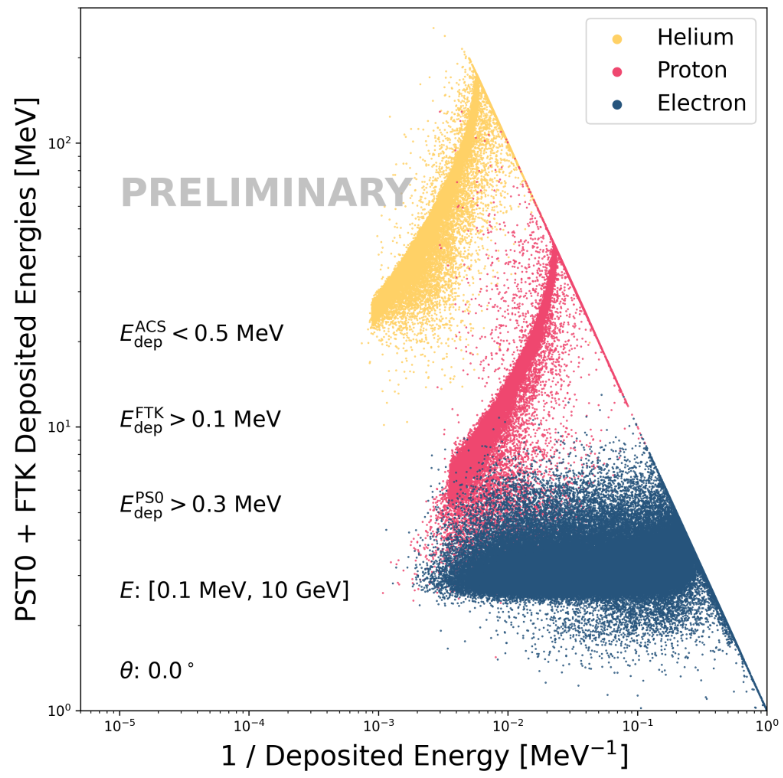 The Low-Energy Module (LEM) is a compact spectrometer designed to measure the direction, energy, and composition of low-energy charged particles with event-level resolution. The fully assembled detector is a compact 10 ×10 ×10 cm³ cube, hosting five independent Δ𝐸–𝐸 channels pointing towards the zenith. On the left, the plot shows how electrons, protons, and alpha particles occupy distinct regions in the PID–energy plane, making it possible to identify each event individually. The colour scale indicates the event density on a logarithmic scale, highlighting the clear separation between particle types. On the right, a diagram illustrates how the Low Energy Module (LEM) detects incoming particles. Depending on their energy, particles may stop within the silicon layers, pass through into the plastic scintillator calorimeter, or be rejected by the surrounding veto detectors. This combination of ΔE–E telescopes with active collimation and veto systems ensures that only well-reconstructed and correctly identified events are used in scientific analyses.